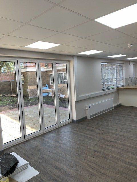 New underground drainage, door openings, partitions, suspended ceilings, flooring, bi-folding doors and patio